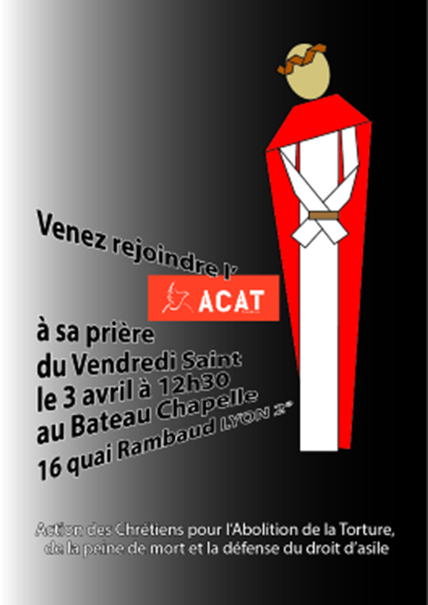 L’ACAT (Action des chrétiens pour l’abolition de la torture) de Lyon propose un temps de prière à 12h30 le Vendredi Saint au bateau chapelle 16 quai Rambaud, Lyon
